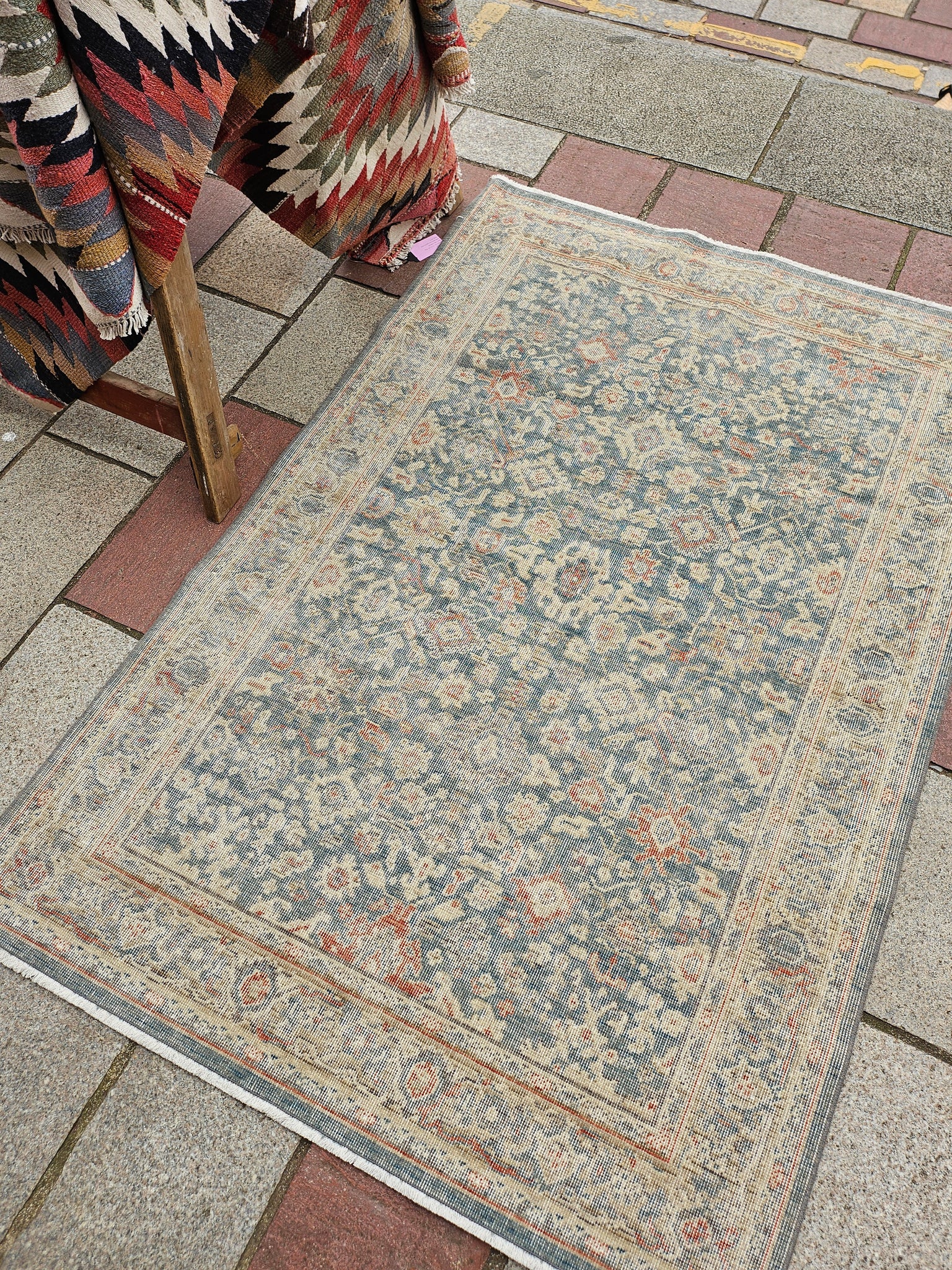 A beautiful muted Turkish Anatolian area rug featuring soft dusty blues, gentle pinks, olive green, clay, and mocha slate tones. Handwoven from organic wool and coloured with natural vegetable dyes in subtle grey and beige shades, this piece dates back to the 1970s.