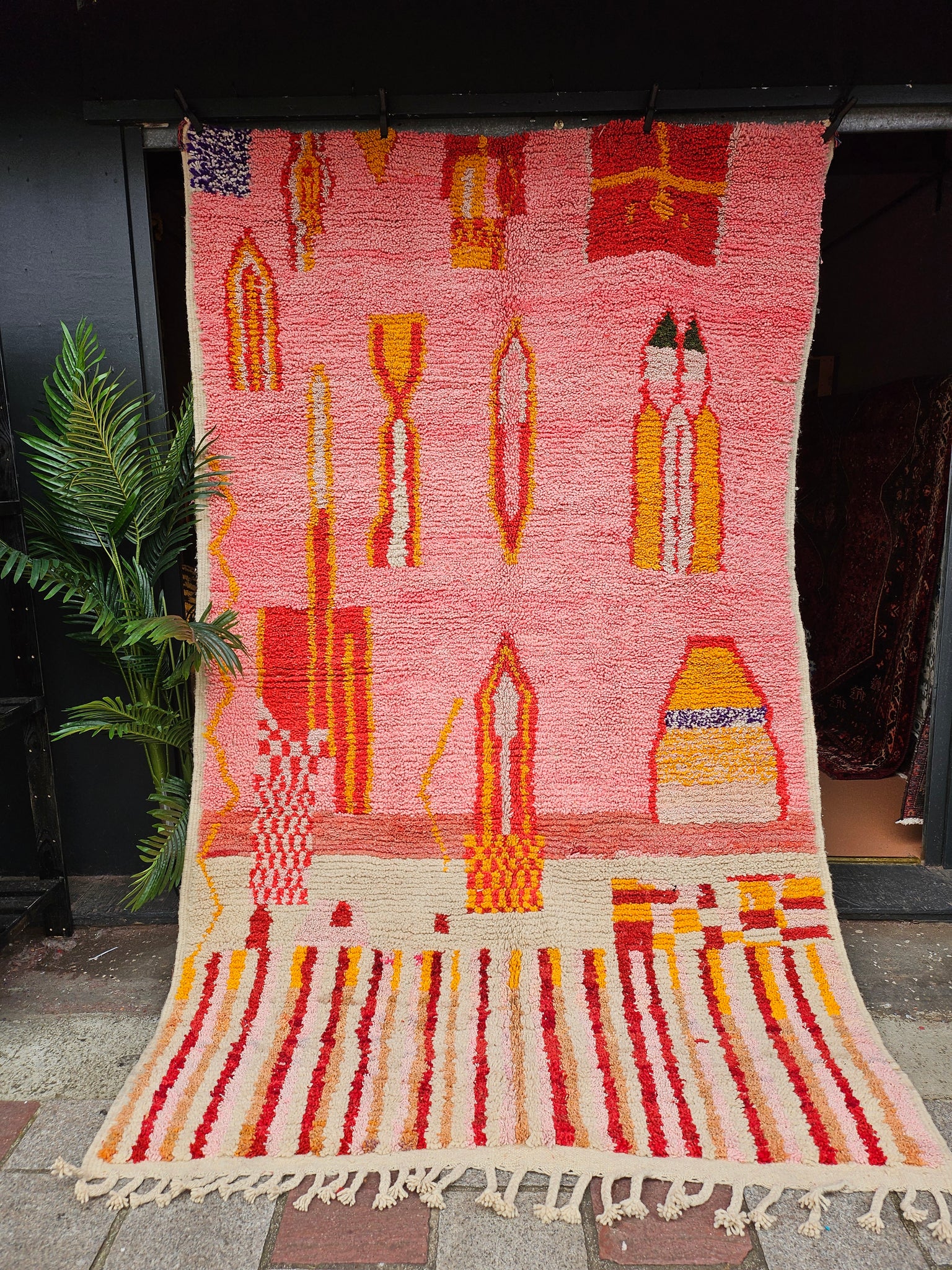 Boujaad rugs are celebrated for their rich, warm colours - in this piece, soft pinks, reds, oranges, creams, and maroons - often created using natural dyes derived from plants and minerals. The patterns are typically asymmetrical, showcasing geometric designs, Berber symbols, and abstract motifs that reflect the cultural stories and personal expressions of the weaver.
