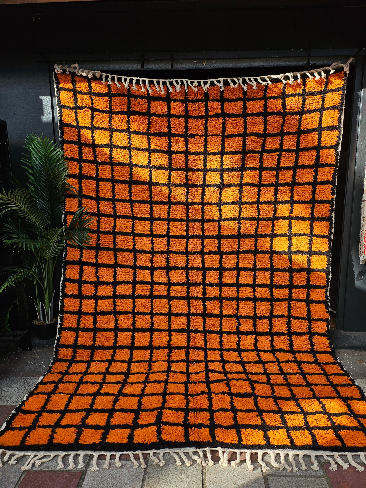 Vegetable dyes in burnt orange and black wool have been used to create this punk-like checkered design and weave within the rug.