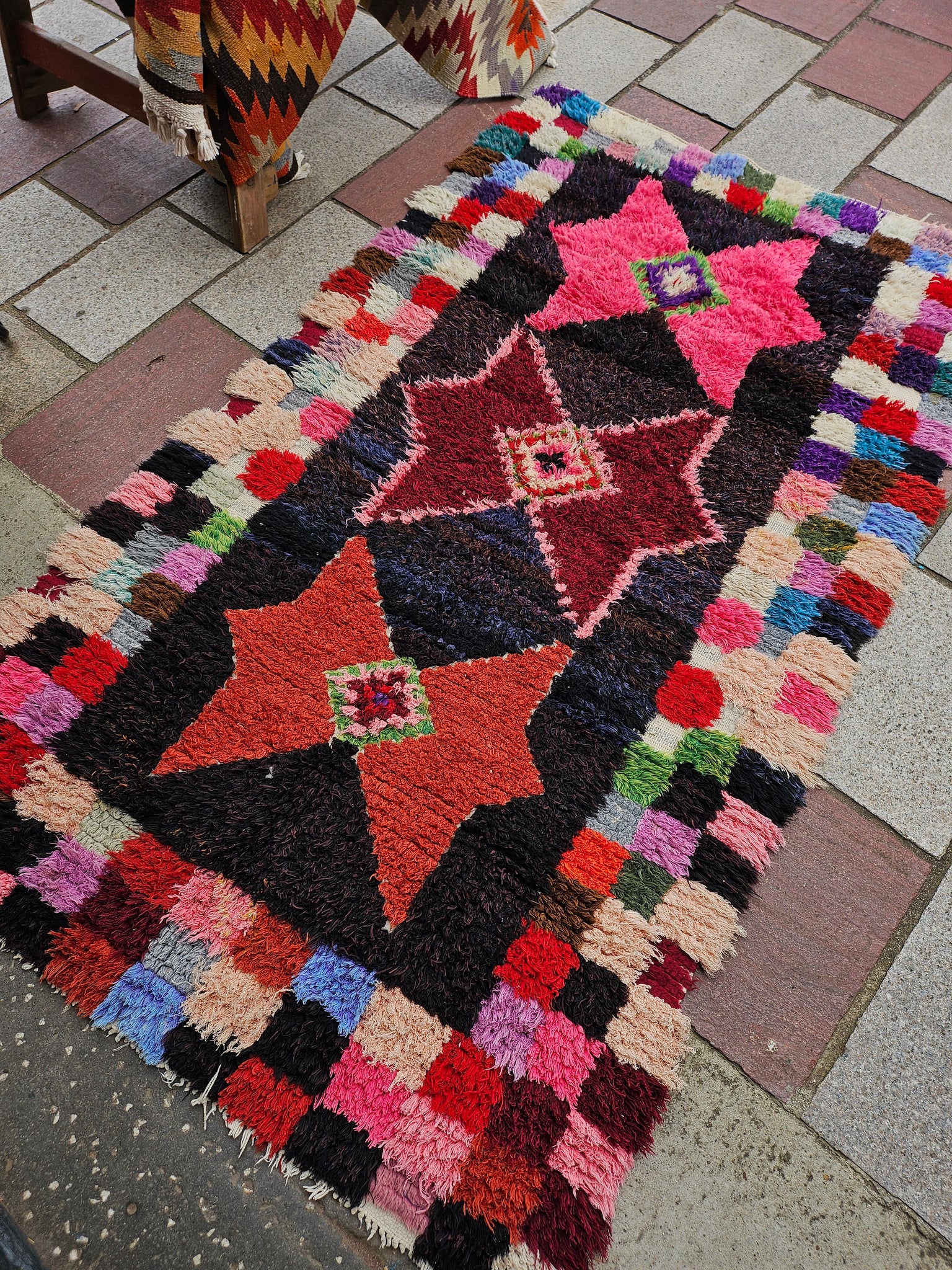 Rania is a gorgeous colorful vintage boucherouite rug in vibrate pink, teal, green and maroon again.